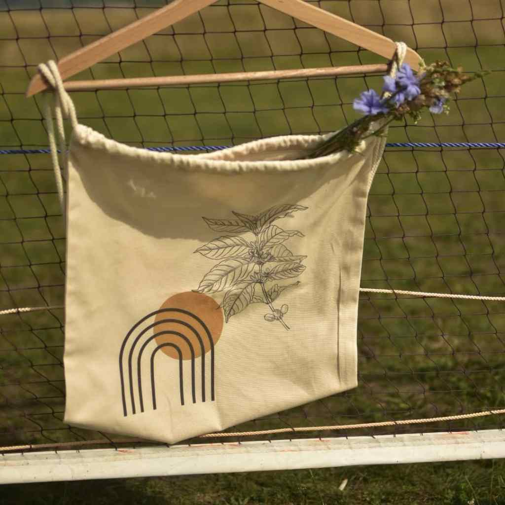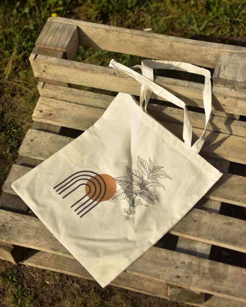 If you want that extra shot of espresso free of charge, just wink over to your favorite barista swinging your tote with a coffee plant design.
